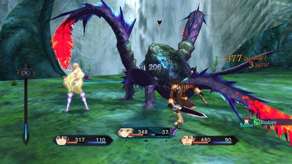O combate de Tales of Xillia é bastante agradável, e agora, rodando a 60 fps, está ainda melhor. Ao encostarmos em um inimigo, entramos em uma espécie de arena, onde podemos controlar livremente nosso personagem enquanto os demais são controlados pela IA.