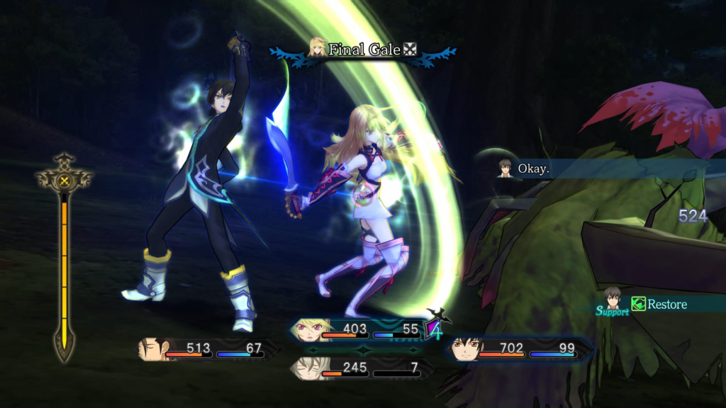 Durante as batalhas, também podemos linkar dois personagens, o que possibilita o uso de habilidades combinadas. Uma barra especial é preenchida conforme lutamos, permitindo o uso de golpes poderosos tanto individualmente quanto em dupla. Cada combinação de personagens resulta em habilidades únicas e visualmente impressionantes, vale muito a pena experimentar diferentes formações.