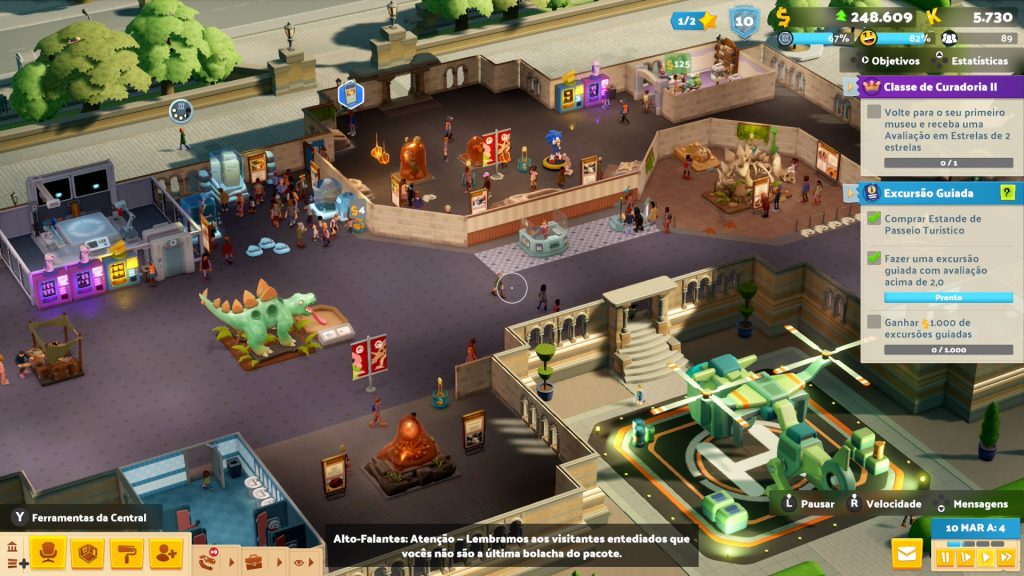 De início, você possui poucas preocupações, já que cada uma dessas “engrenagens” é apresentada de maneira separada. Tudo isso ocorre com objetivos claros e específicos, que mostram claramente qual o seu próximo passo. Aos pouquinhos desse jeito, Two Point Museum apresenta um sistema que se torna absurdamente complexo, envolvendo elementos cada vez mais específicos, como excursões, campanhas de marketing, além de problemas que você precisa lidar, como ladrões e vândalos.