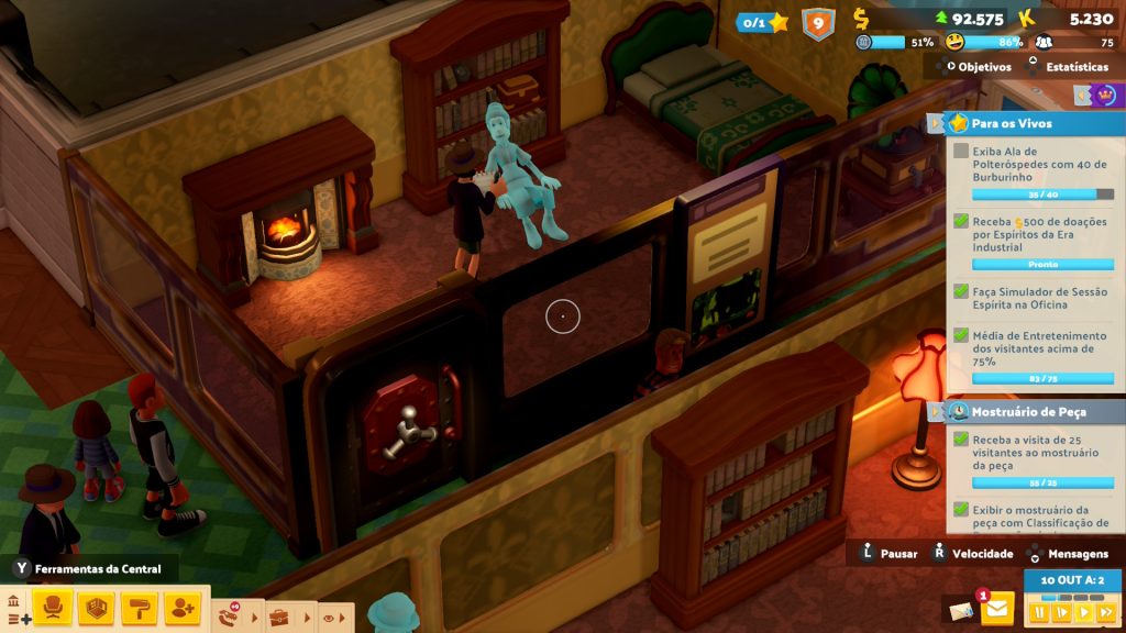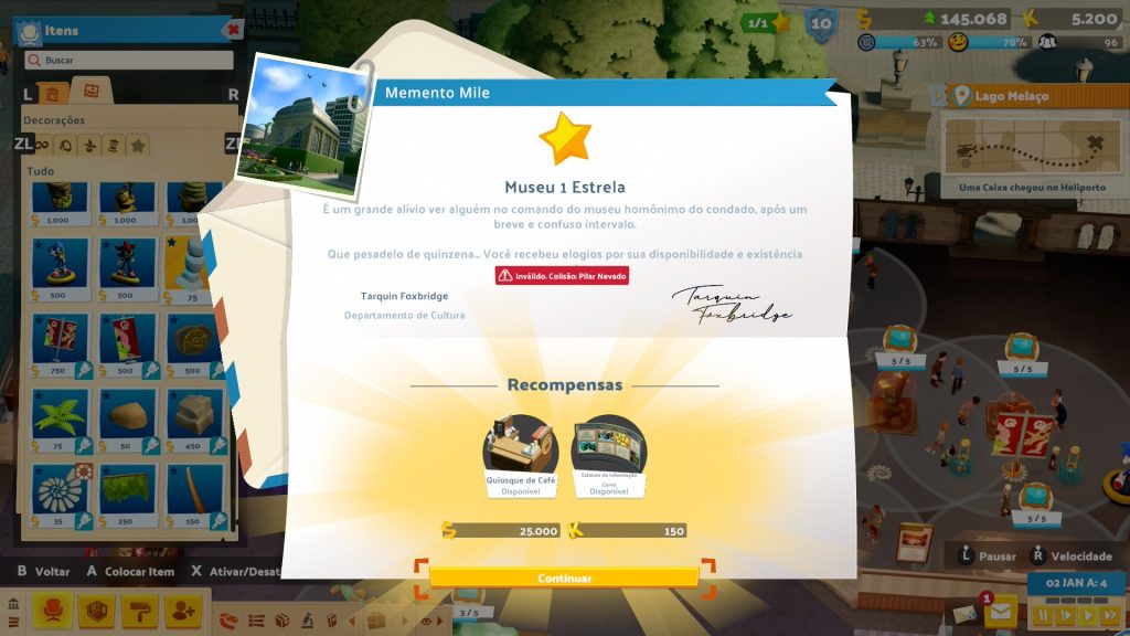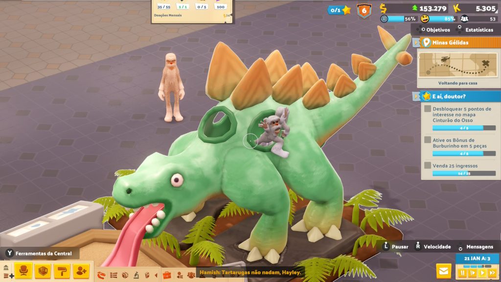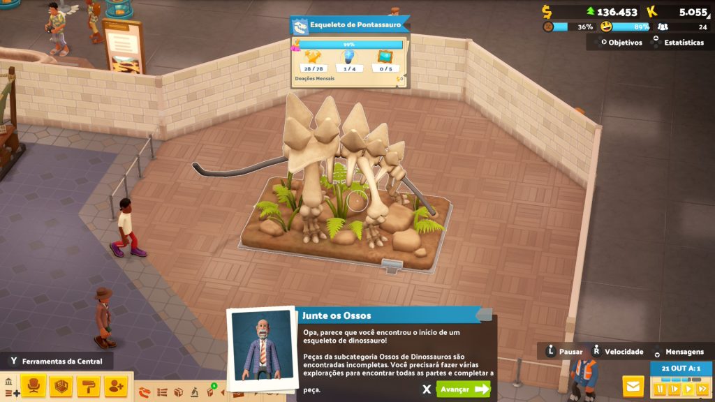 Devido ao tipo específico de gameplay que Two Point Museum oferece, essas quedas não atrapalham necessariamente a sua jogatina, mas é um incômodo que se torna um tanto quanto constante em momentos mais avançados da campanha. Além disso, existem alguns pequenos bugs em caixas de texto presentes aqui e ali na campanha. Vale ressaltar que o texto e tradução em português do Brasil estão ótimos, mas em alguns menus você pode encontrar alguns espaços extras, ou texto cortado em caixas que você não consegue ler por inteiro.