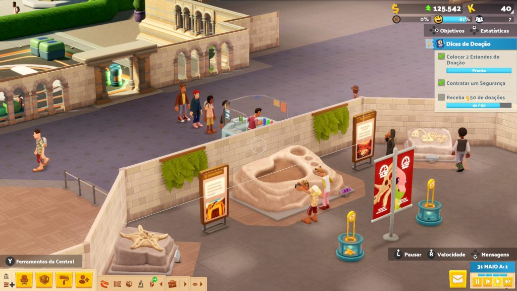 Por fim, o último aspecto negativo de Two Point Museum não está necessariamente em um problema, mas sim em uma ausência. Como um jogo de gerenciamento muito focado em construção, é uma pena que a versão de Switch 2 não tenha recebido suporte aos controles de mouse, que poderiam facilitar e ajudar muito a relevar um pequeno problema desse tipo de jogo: alguns menus um tanto quanto convolutos, com informações que parecem “escondidas” e são um pouco complexas de se encontrar de início. Como o jogo continua recebendo suporte e conteúdo em todas as plataformas, vamos torcer para que o fps melhore e que eles consigam adicionar suporte ao mouse.
