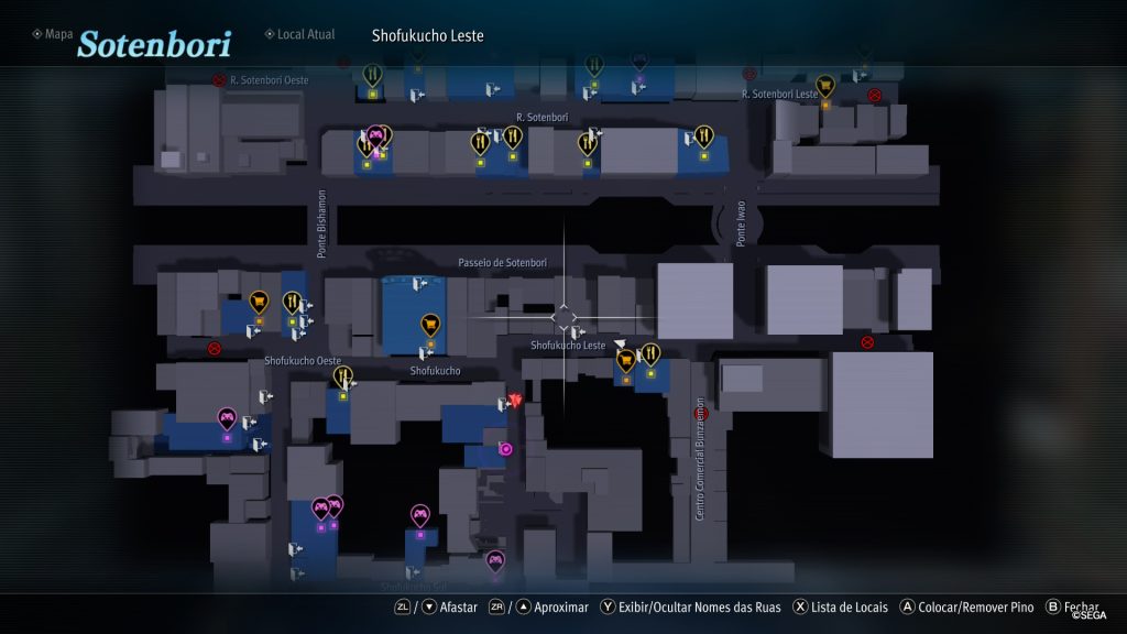 Além de Kamurocho, você também tem acesso a Sotembori, e ambos os mapas apresentam melhorias de qualidade de vida. (Imagem: Jhonatan Carneiro)