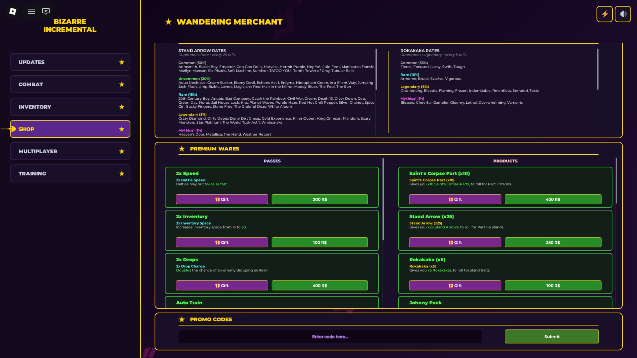 JoJo Bizarre Incremental no Roblox possui códigos promocionais que liberam recompensas gratuitas para ajudar na progressão do jogador. Os códigos de JoJo Bizarre Incremental permitem receber itens importantes como Flechas de Stand, EXP e Ienes, recursos usados para evoluir mais rápido no jogo sem depender apenas do progresso normal.