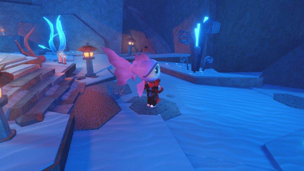 Dentro das cavernas, o jogador deve seguir em frente na primeira bifurcação até alcançar a área do NPC Golem. Após passar por ele, é necessário continuar descendo até chegar a uma grande câmara interna. Esse local costuma ter tubarões-martelo e outros peixes agressivos, e é ali que o Eyefish em Abyss pode aparecer.