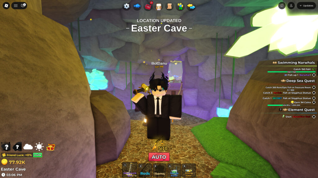 Onde fica o Amuleto de Ovo Pastel em Fish It? Dentro da Caverna de Páscoa, próximo à caixa rosa na segunda sala após atravessar a ponte.