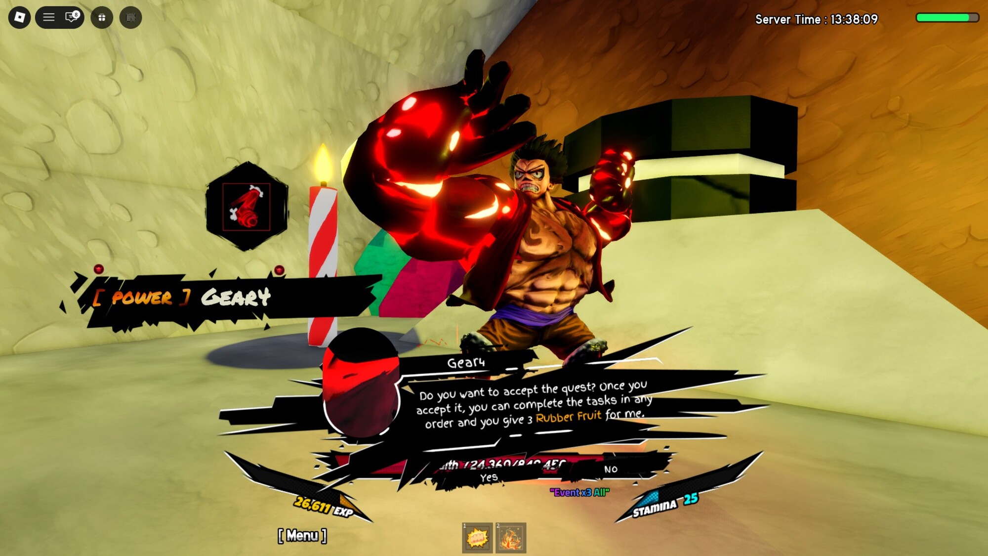Com todos os objetivos concluídos, retorne ao NPC do Gear 4 na Ilha do Bolo e fale com ele para desbloquear o Bounceman. Os requisitos mais demorados são acumular 500.000.000 de dano recebido e derrotar o Chefe Mundial, então priorize essas metas desde o início para não atrasar o processo.