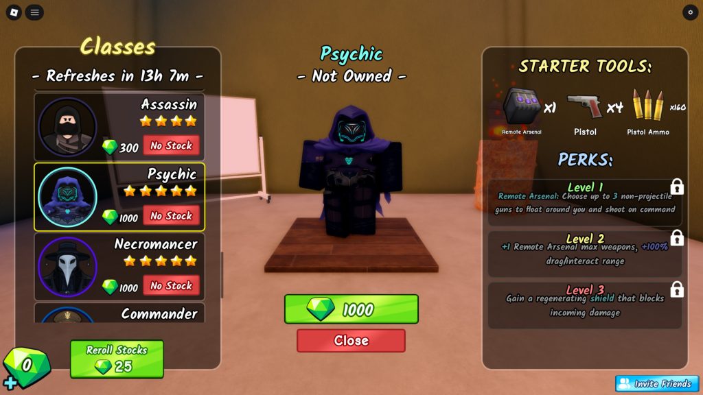 A classe Psíquico em Survive the Apocalypse custa 1.000 Gemas para ser desbloqueada e começa equipada com um Arsenal Remoto, 4 pistolas e 160 unidades de munição. Esse conjunto inicial já favorece o jogo solo, diferente de classes mais voltadas para suporte em equipe.