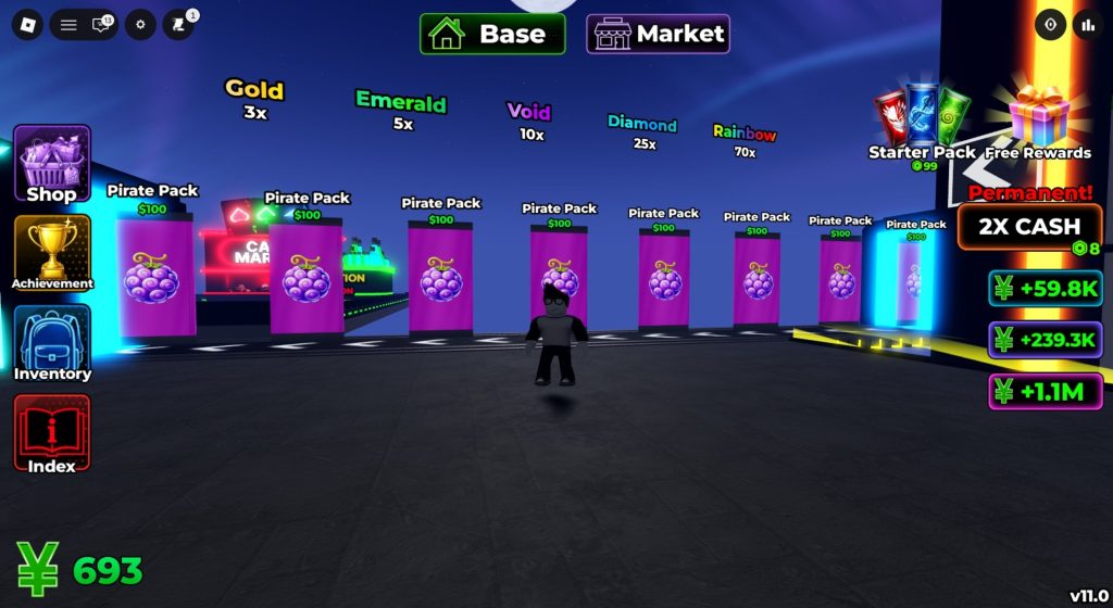 Ao iniciar, você recebe uma quantia de dinheiro e pode comprar seu primeiro pacote de pirata, disponível na esteira à esquerda da sua base. Coloque o pacote no chão e, após alguns segundos, clique nele para revelar uma carta aleatória. Ela será automaticamente armazenada no álbum, localizado em frente à base.