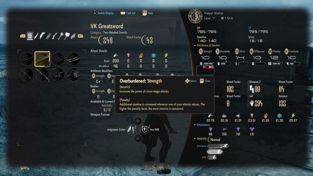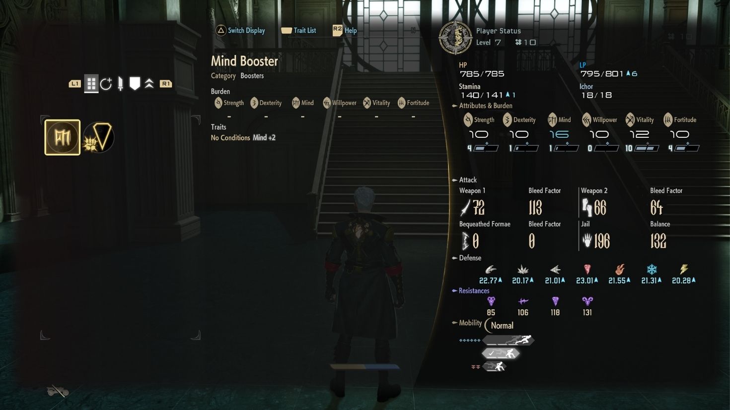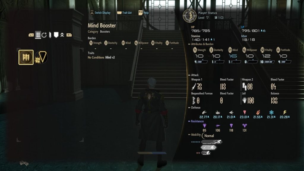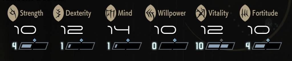 Mente afeta a duração das Forme de suporte e também interfere no poder das habilidades mágicas, que escalam ainda mais com Determinação. Já Vitalidade e Fortitude lidam com sobrevivência e resistência.